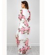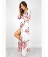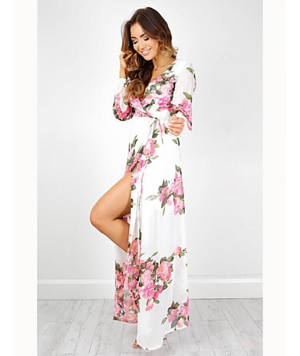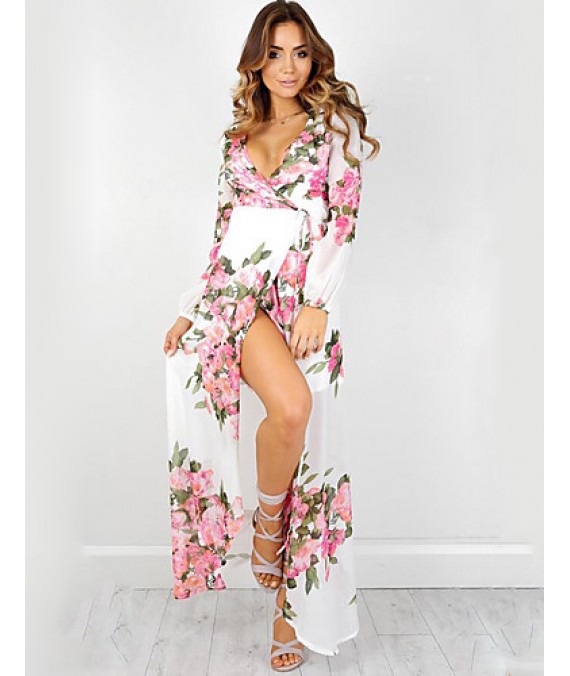 Women's Going out Boho Swing Dress,Floral Deep V Maxi Long Sleeve White Polyester Summer