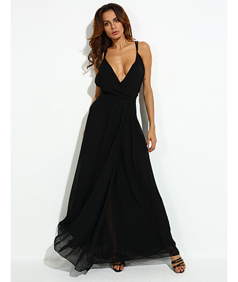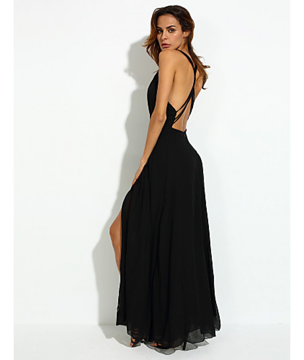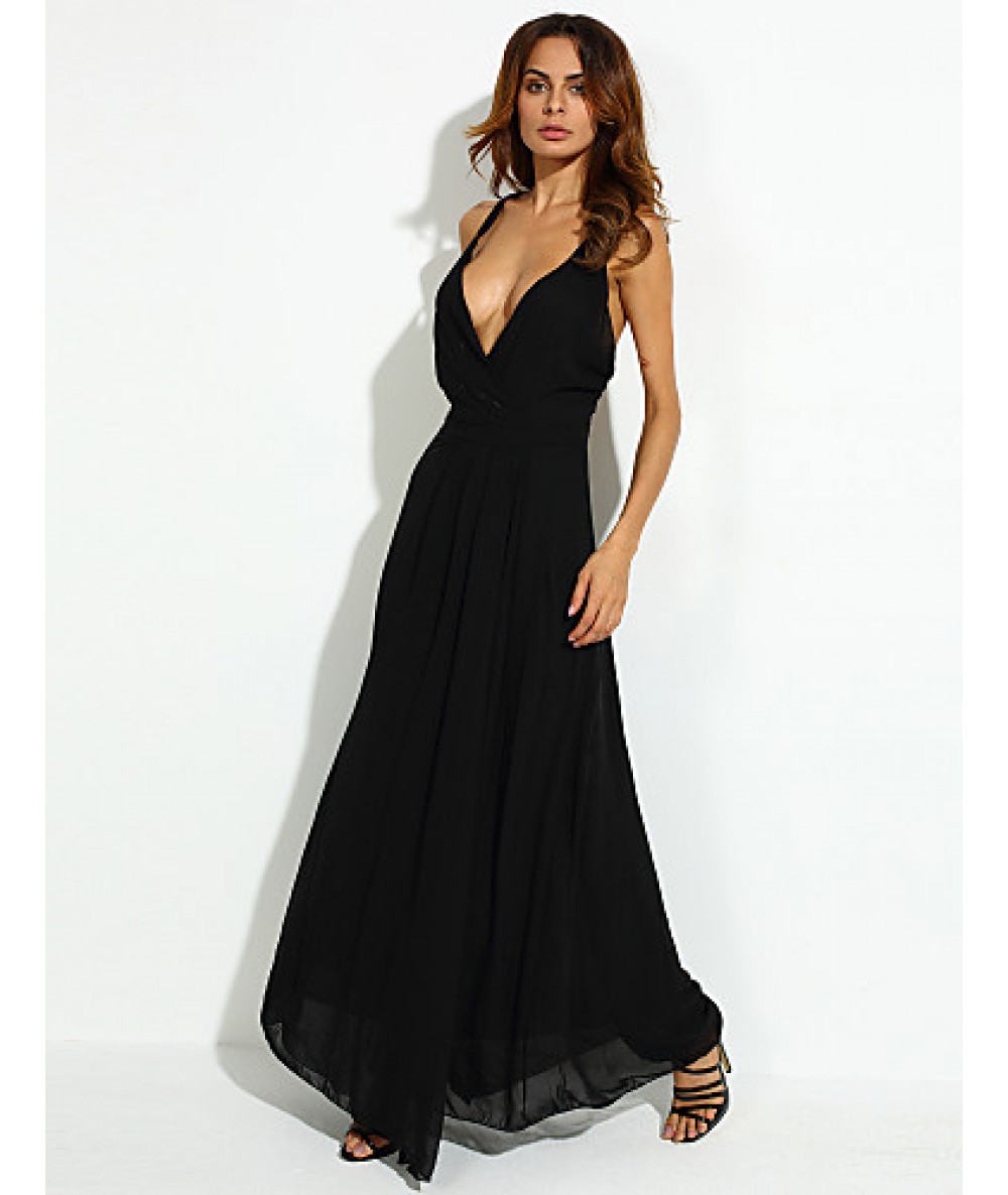 Women's Party/Cocktail Sexy Loose Dress,Solid V Neck Maxi Sleeveless Black Polyester Summer