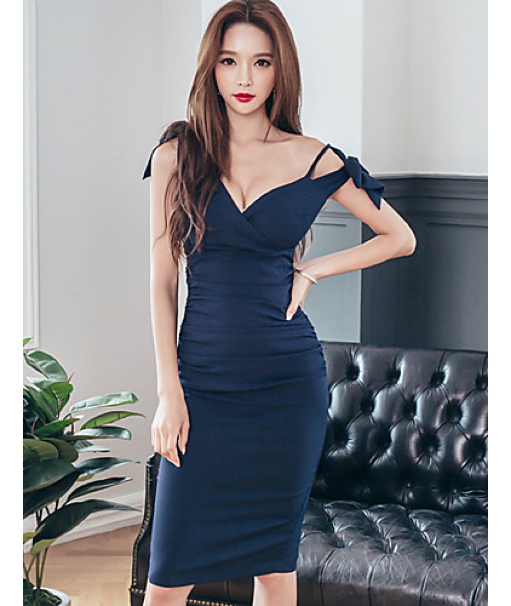 Women's Party/Cocktail Sexy Bodycon Dress,Solid Deep V Knee-length Sleeveless Blue Polyester Summer