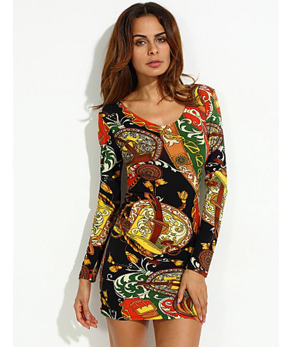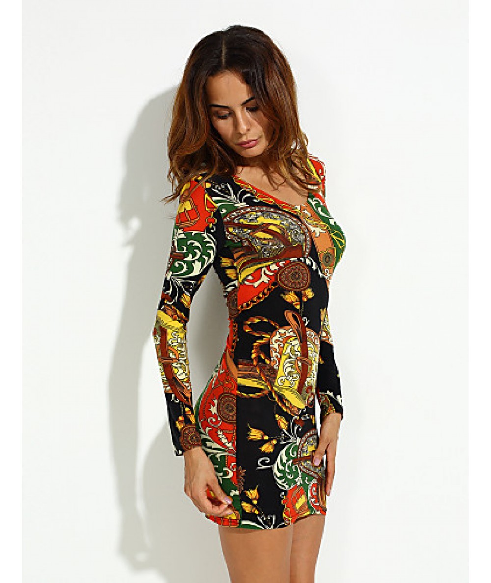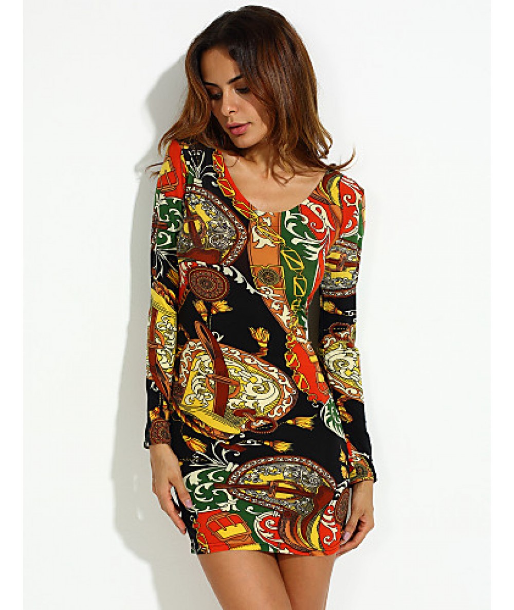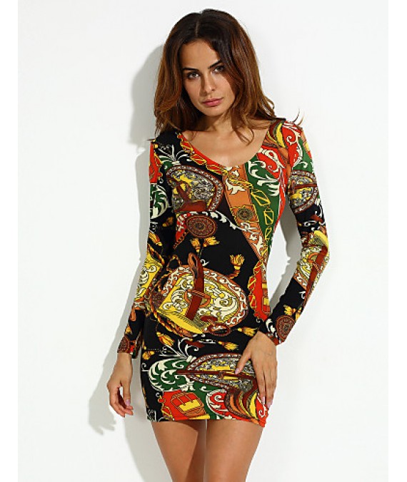 Women's Vintage Sexy Bodycon Print Cute Plus Sizes MicroElastic Long Sleeve Above Knee Dress (Microfiber)
