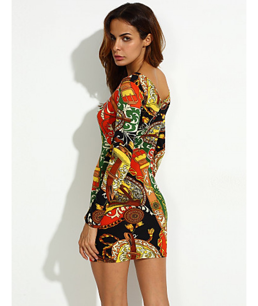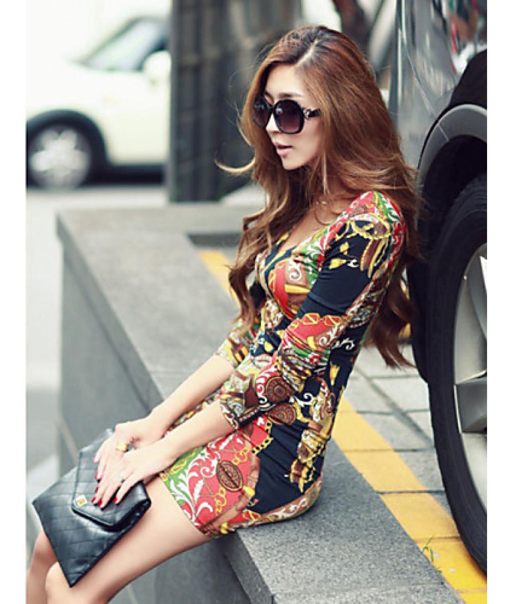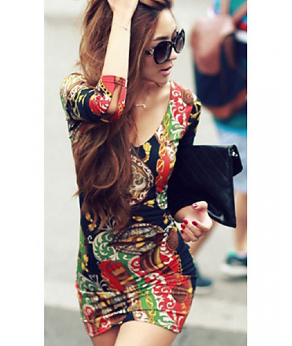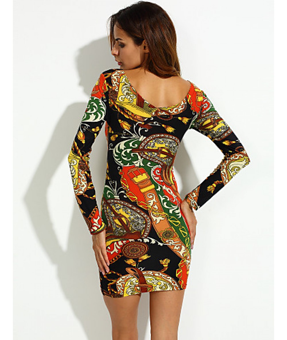 Women's Vintage Sexy Bodycon Print Cute Plus Sizes MicroElastic Long Sleeve Above Knee Dress (Microfiber)