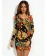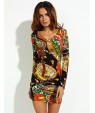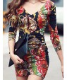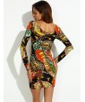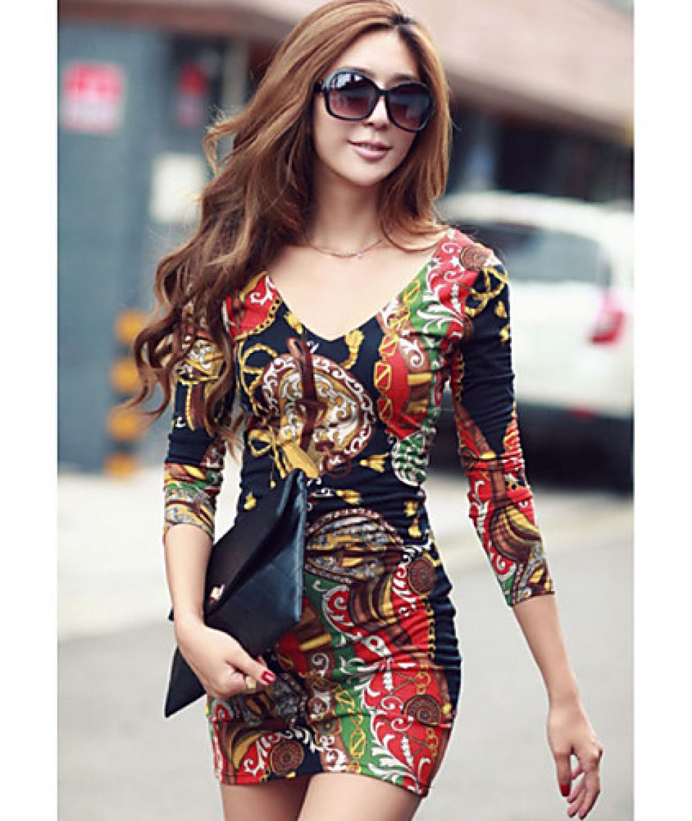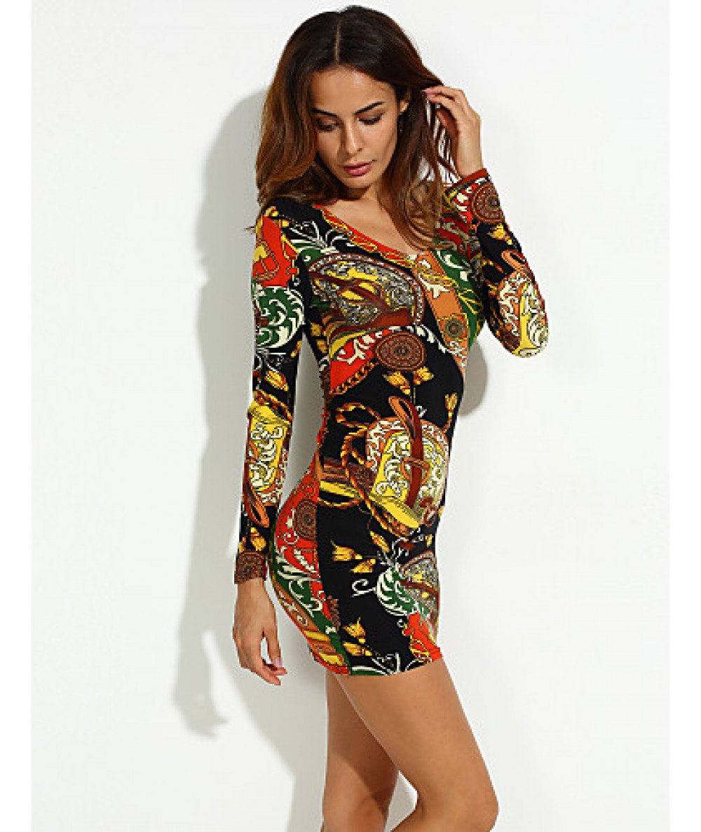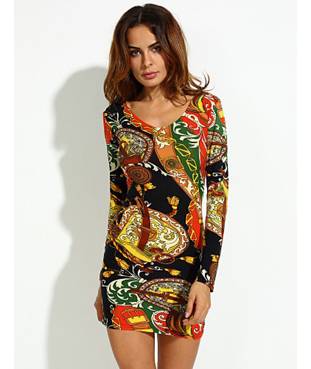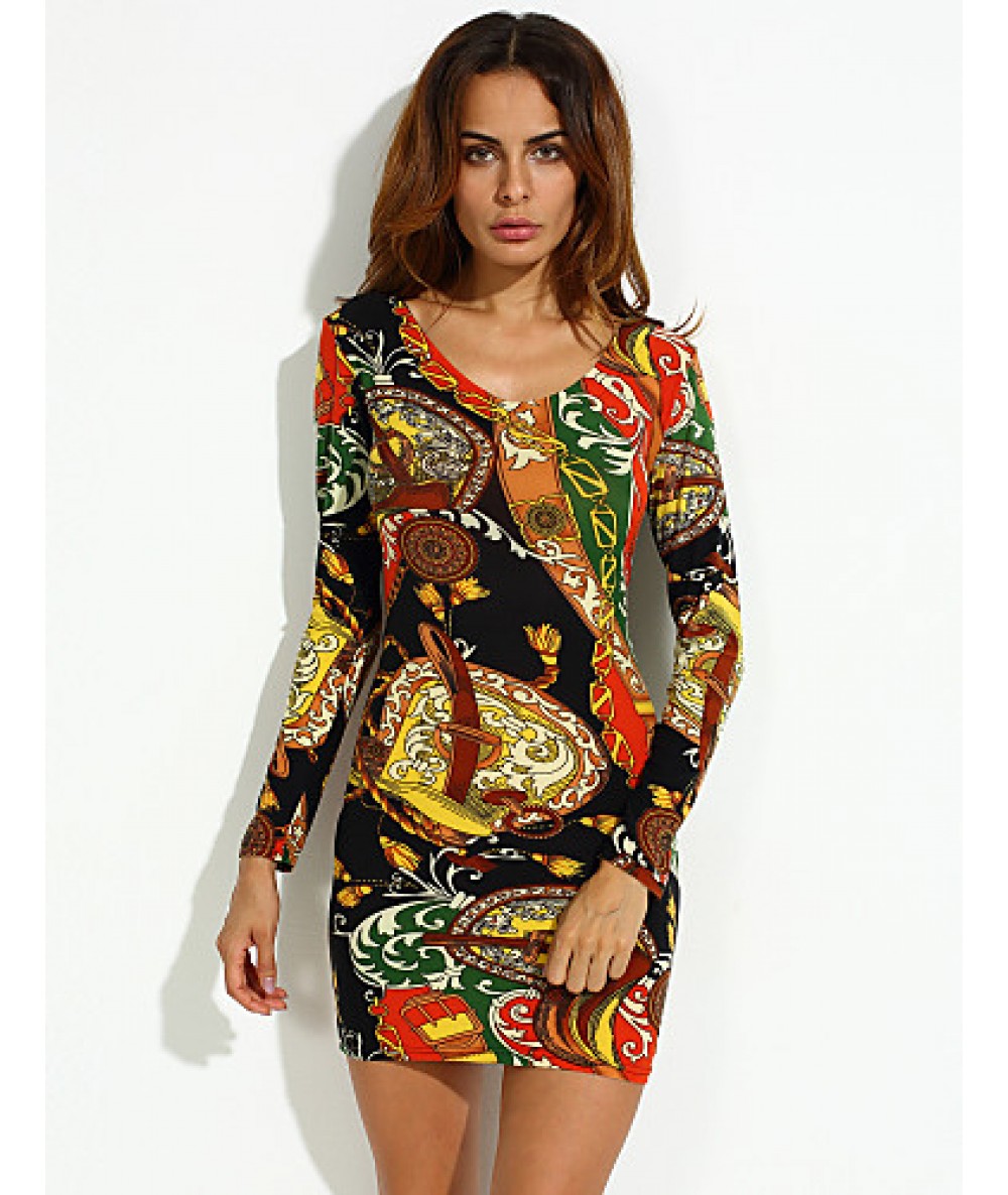 Women's Vintage Sexy Bodycon Print Cute Plus Sizes MicroElastic Long Sleeve Above Knee Dress (Microfiber)
