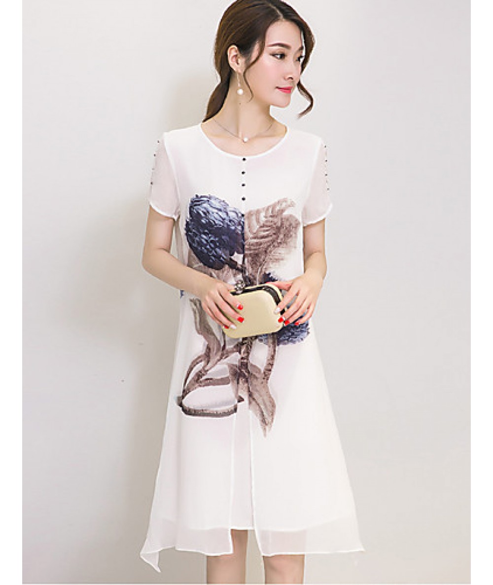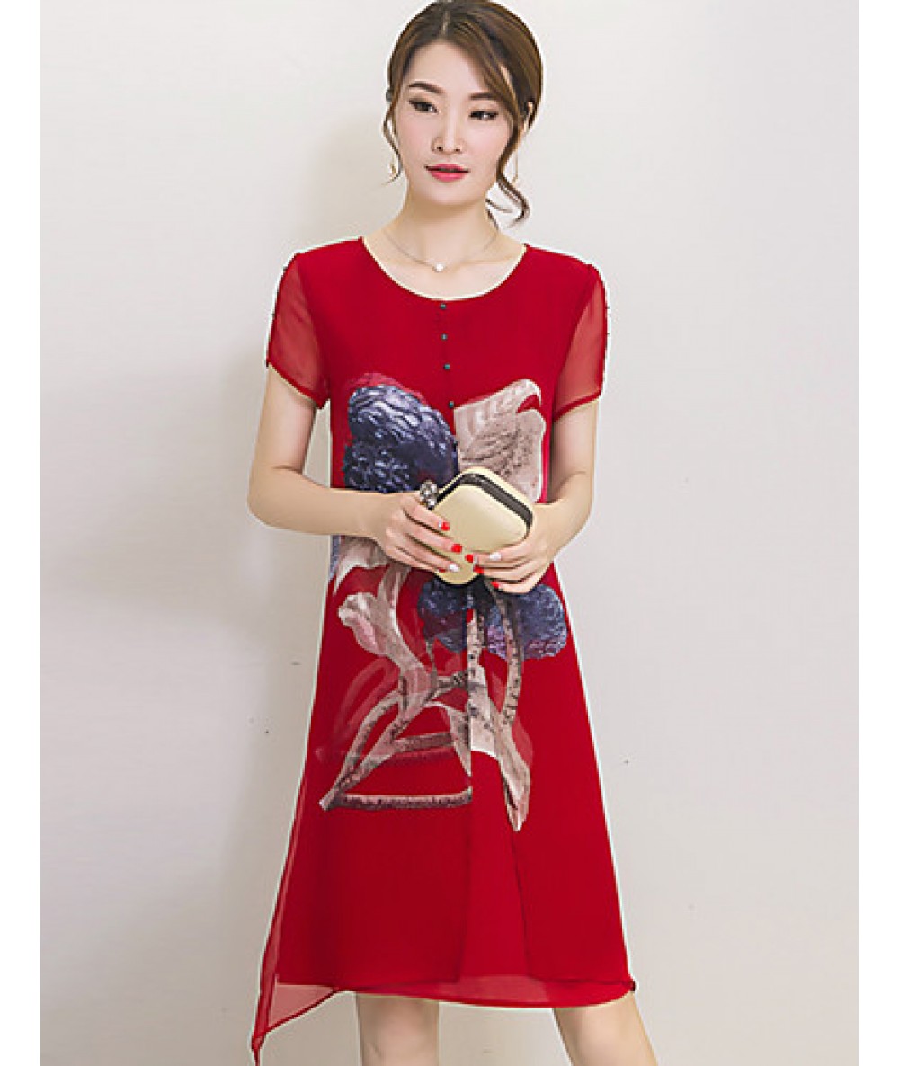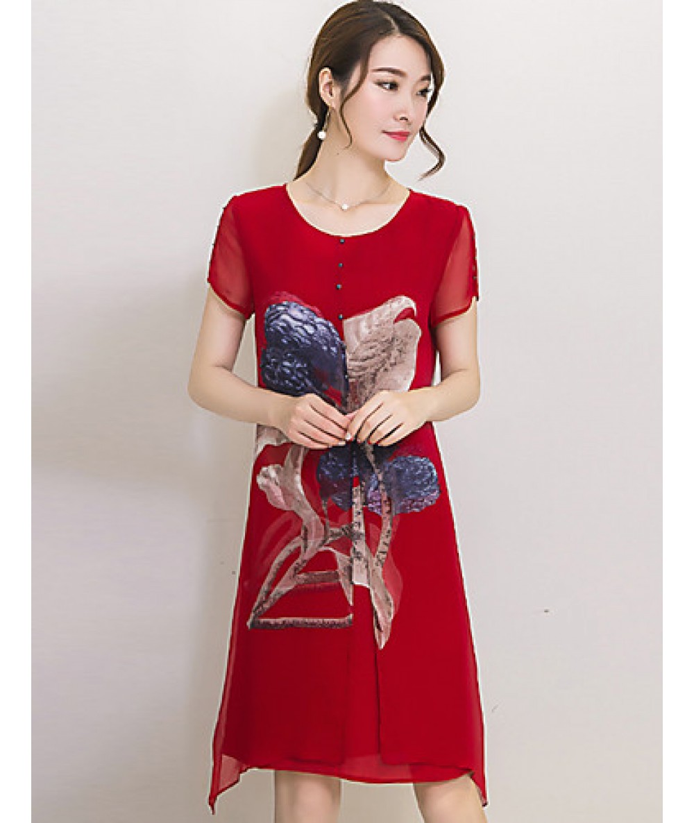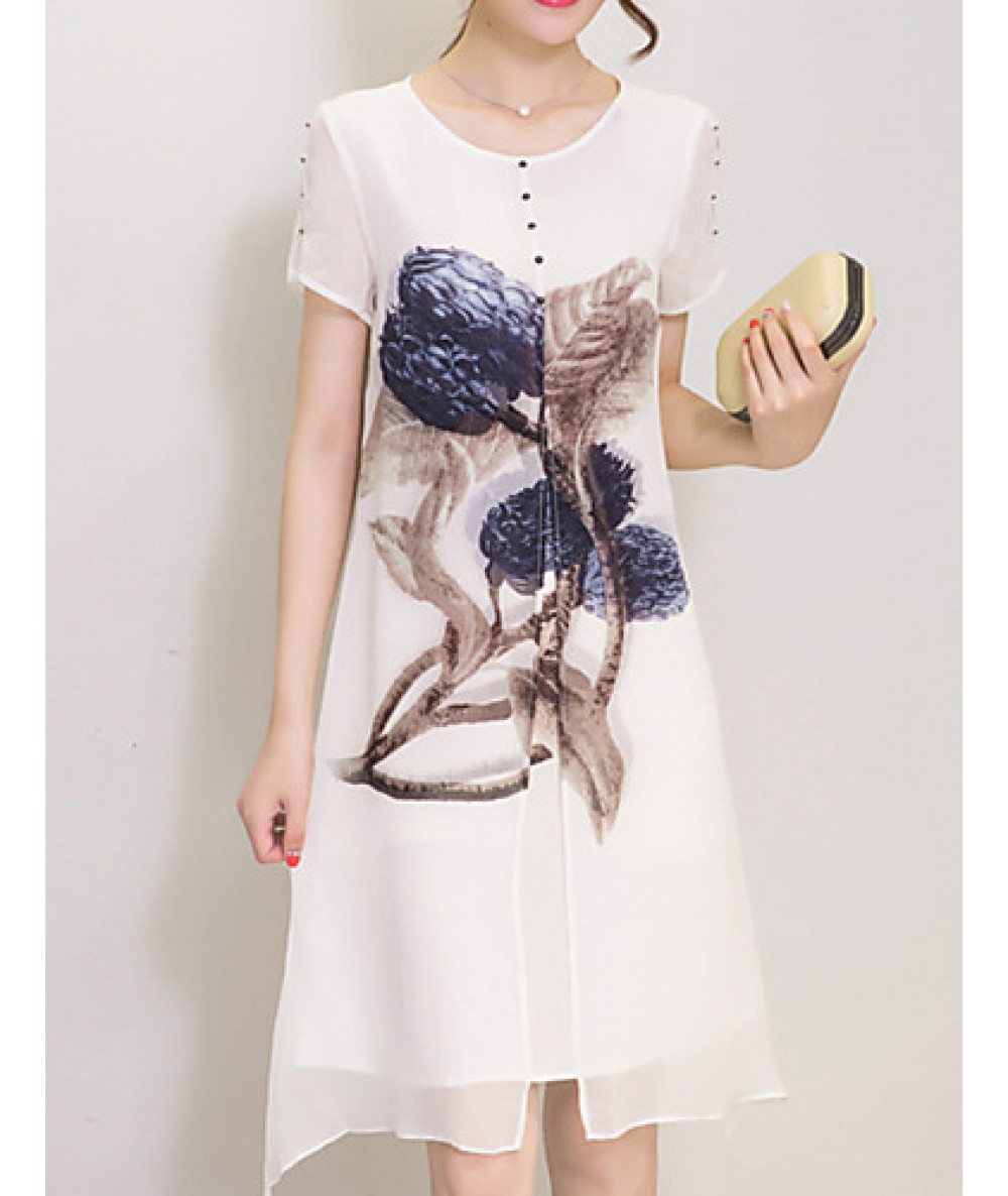 Women's Street chic Print Plus Size / Loose Dress,Round Neck Knee-length Silk / Polyester